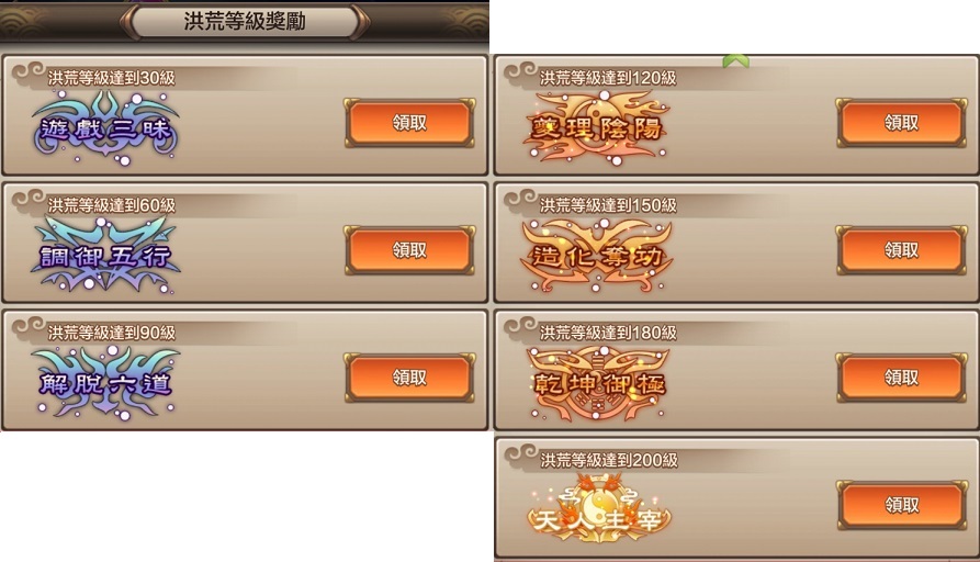 當洪荒等級達指定等級,可獲得洪荒稱號獎勵: