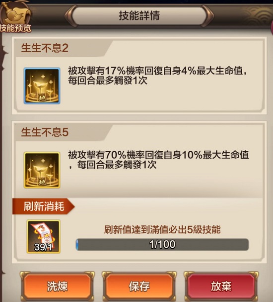 ※洗煉過程中也有機率洗到五級技能,每次洗出五級技能時,洗煉值將歸零