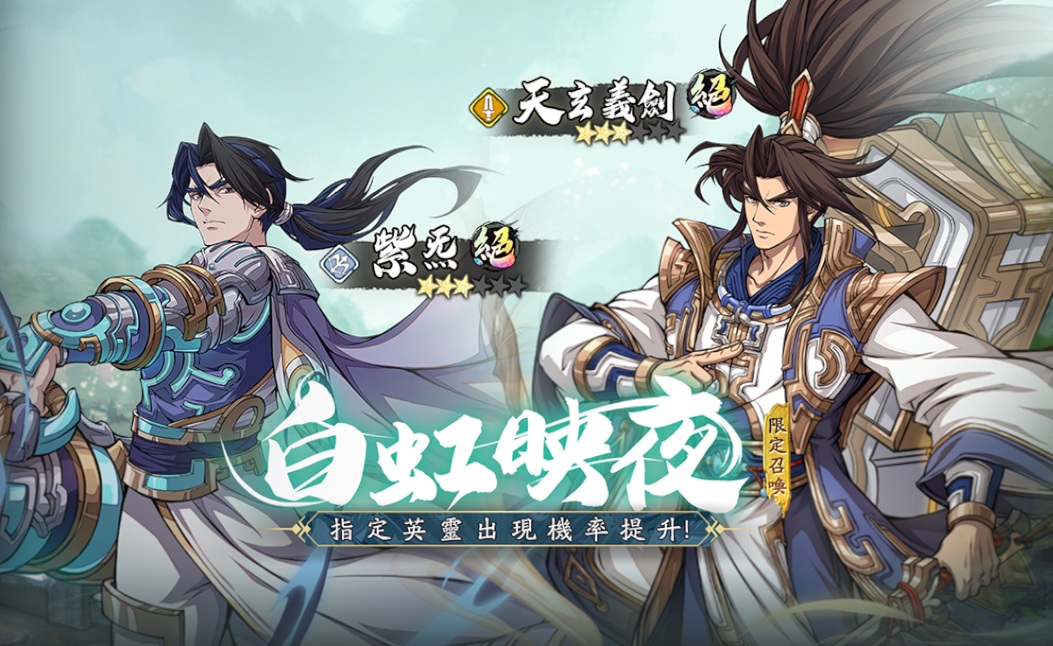 ➤白虹映夜限定召喚開啟,絕品英靈紫炁、天玄義劍召喚機率提升。(更多英靈絕學介紹可前往遊戲內“資訊”查看)