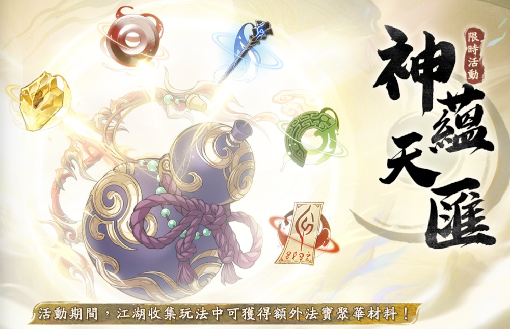 ➤活動期間,解鎖「神佑秘庫」玩法後,每次收集(掃蕩)時獲得的物品(法寶聚華材料)數量增加。