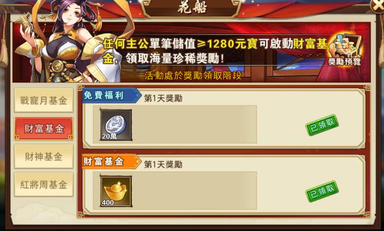 ※玩家只要單筆儲值超過1280元寶, 即可獲得花船財富基金領取資格,