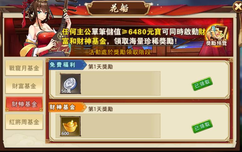 ※玩家只要單筆儲值超過6480元寶, 即可獲得花船財神基金領取資格