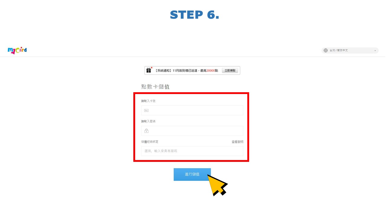 STEP6.填入於7-ELEVEN所購買的MyCard1000點卡號及密碼進行儲值