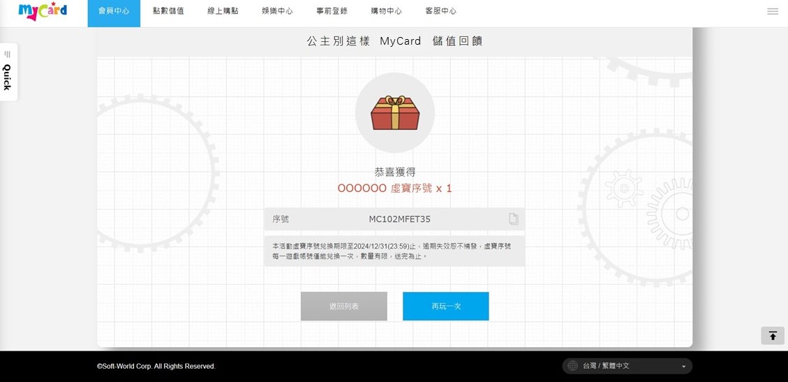 c. 序號兌換期限至2024/02/29,逾期失效。♛MyCard活動領獎專區流程示意♛